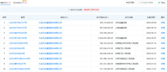 根据天眼查信息,万达集团有10条被执行人信息,被执行总金额达52.63亿元,执行法院包括北京金融法院、上海金融法院、兰州市中级人民法院、郑州市中级人民法院等,单笔执行金额均在1亿元以上,最大一笔超过24亿元。立案时间集中在2025年。
