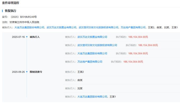 万达集团受资金之困两年多,此前王健林三次成为被执行人,这是首次被限制高消费。该限消令由甘肃省兰州市中级人民法院发放,案号为(2025)甘01执恢249号,被追债的名单中,除了万达集团和万达地产集团有限公司(简称“万达地产”),还有武汉万达文旅、武汉楚河汉街文化旅游投资有限公司。
